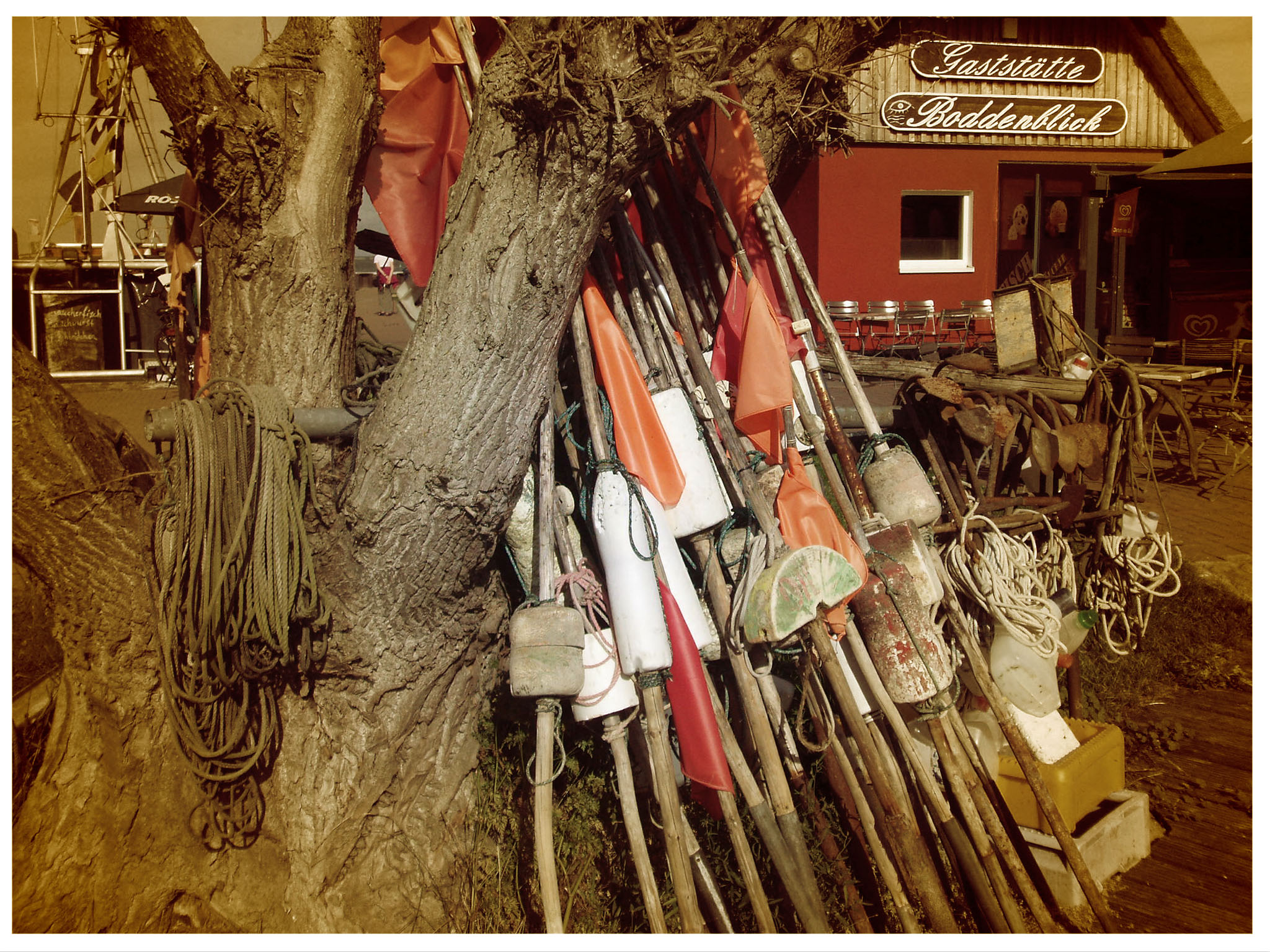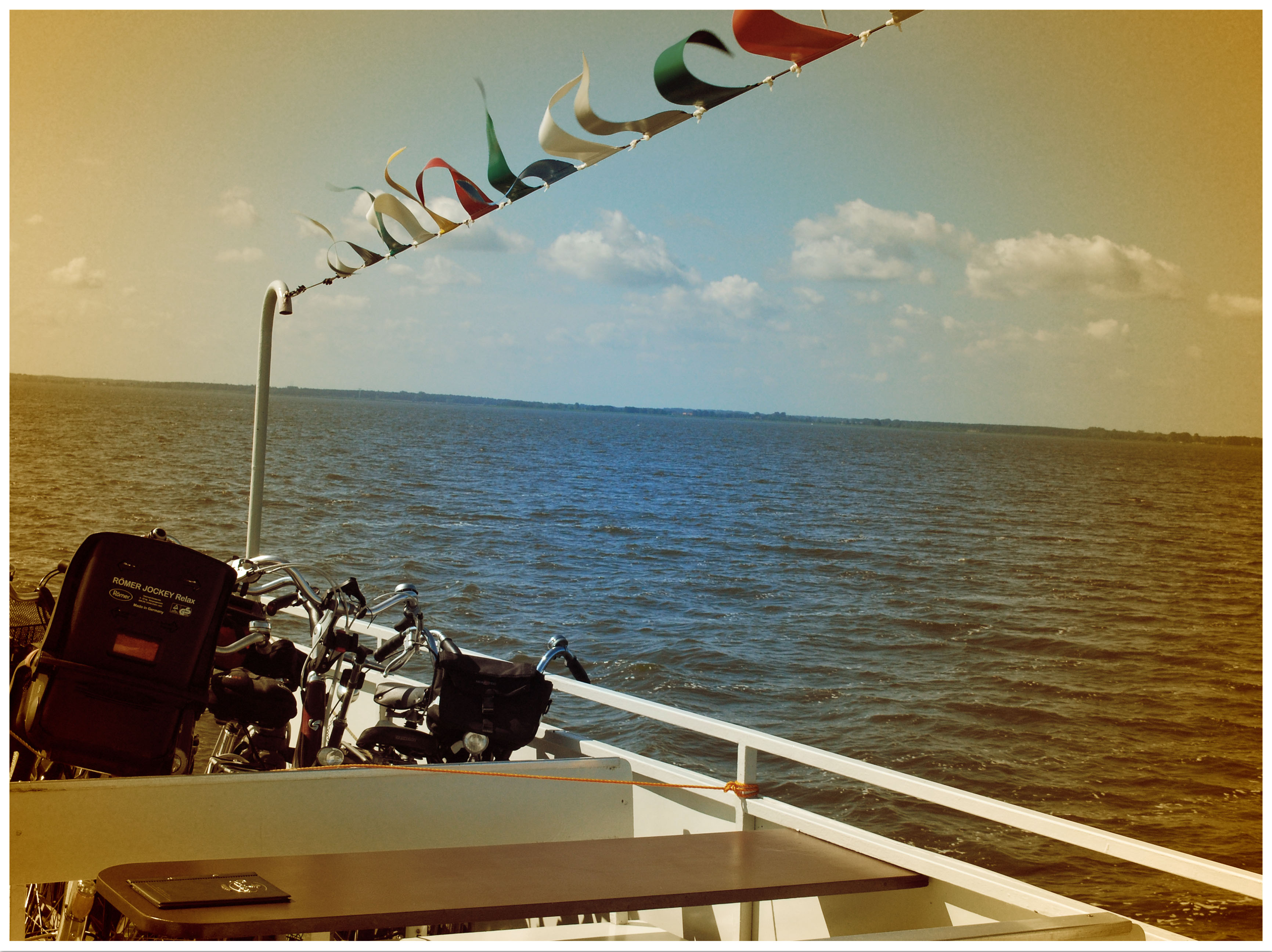 Während wir auf die Fähre warten, holen wir uns noch schnell ein Stück Räucherfisch auf die Hand, dann geht es aufs Wasser. Die Fahrt nach Wustrow, dem nächsten Ort mit einem kleinen Hafen auf der Boddenseite dauert ca. 45 Minuten obwohl sie nur einen kleinen Ausläufer des Boddens umfasst. So groß sind Ausmaße dieses Binnengewässers, die sich allerdings nur auf die Länge und Breite beschränken. Die Wassertiefe liegt überwiegend bei nur 1- 1,5 Meter, weshalb der Bodden auch ein ideales Revier für Surfer und Kite-Surfer ist, die man an vielen Stellen antrifft.