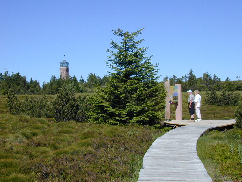 Nach kurzer Zeit kommt schon der große Sendemast auf dem Gipfel der Hornisgrinde in Sicht. Auf dem kahlen Gipfel, der überwiegend von einer Hochheide bedeckt ist, bläst einem meistens ein sehr starker Wind entgegen. Dafür bietet der Gipfel der Hornisgrinde grandiose Ausblicke über den Nordschwarzwald und in die Rheinebene hinunter. Bei klarer Sicht reicht der Blick weiter bis in die Vogesen und nach Straßburg.