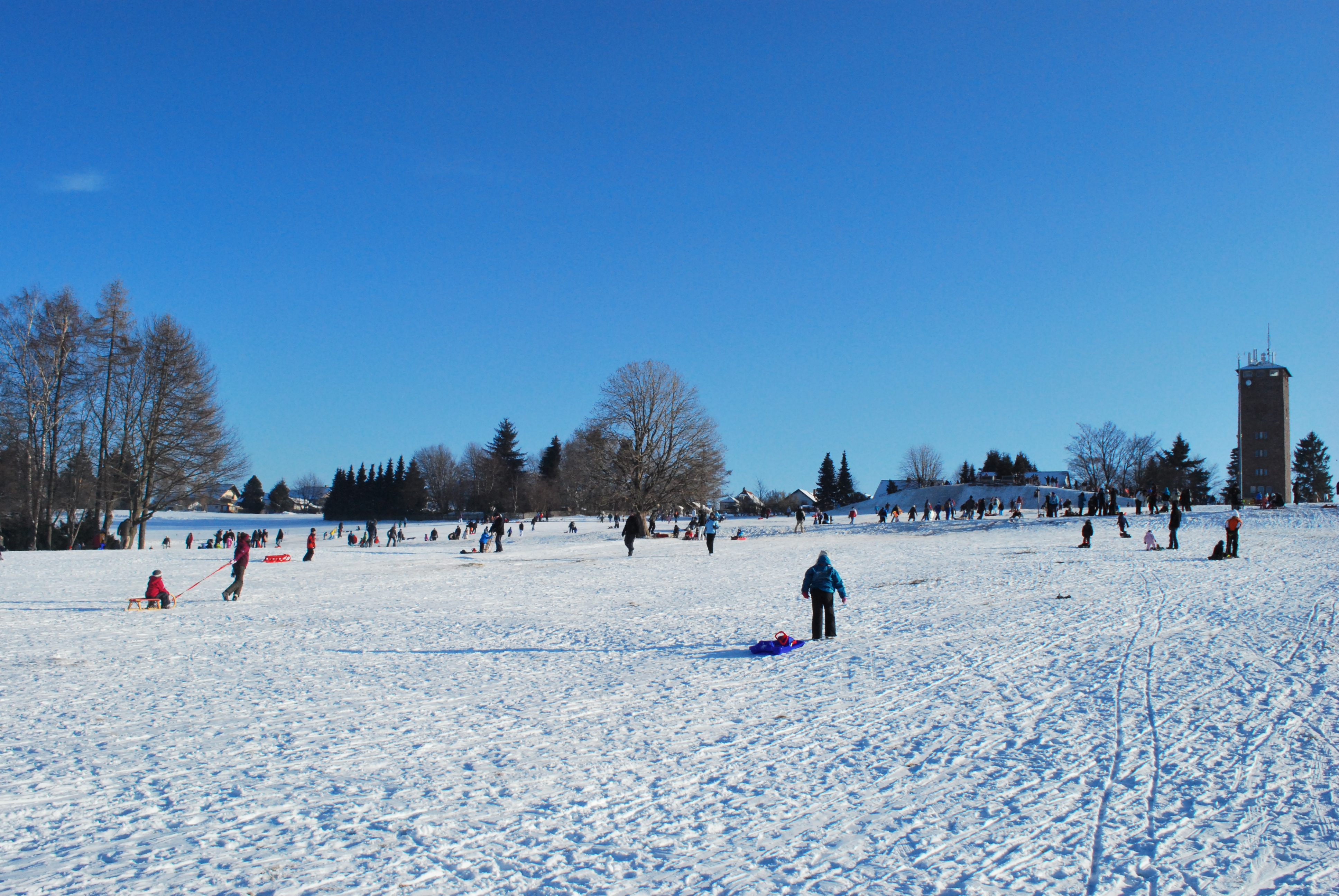 Auch beim Rodeln mit Kindern sollte man nicht gleich mit den schwarzen Pisten beginnen. Den nach meinem Geschmack perfekten Familien-Rodelhang haben wir in Dobel im Nordschwarzwald zwischen Bad Herrenalb und Pforzheim gefunden.  Eigentlich ist Dobel gar kein Wintersportort auch wenn auf den Wiesen noch der ein oder andere alte Schlepplift vor sich hin rostet. Aber die Lage auf einem Hochplateau auf 700 Meter bringt eine gewisse Schneesicherheit und vor allem häufig sonniges und nebelfreies Wetter mit sich.