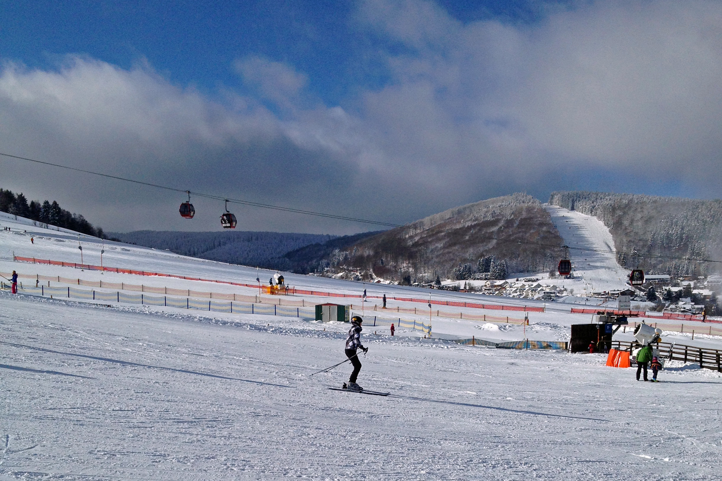 Auch wenn es auf den ersten Blick so aussieht, Willingen ist zumindest an den Wochenenden das Gegenteil von einem ruhigen, beschaulichen Ort. Egal wo man hingeht, die Après-Ski-Musik ist schon da. An der Talstation wird man von Helene Fischer verabschiedet, nur um kurz später „atemlos“ an der Ettelsberghütte direkt neben der Bergstation anzukommen und festzustellen, dass man hier mit Skiern an den Füßen schon fast auffällt. Die Umrüstung des Sessellifts am Ettelsberg auf die neue Kabinenseilbahn war daher wahrscheinlich auch keine technische Notwendigkeit um den Höhenunterschied von gerade mal 230 Metern zu überbrücken, sondern dient wohl eher dazu, um alle Feiernden von der Ettelsberghütte sicher zurück ins Tal zu bringen. Was das Unterhaltungsprogramm angeht hat sich Willingen also seine Sterne im Ski-Atlas verdient, aber wie sieht es mit den Skimöglichkeiten für Familien mit Kindern aus?