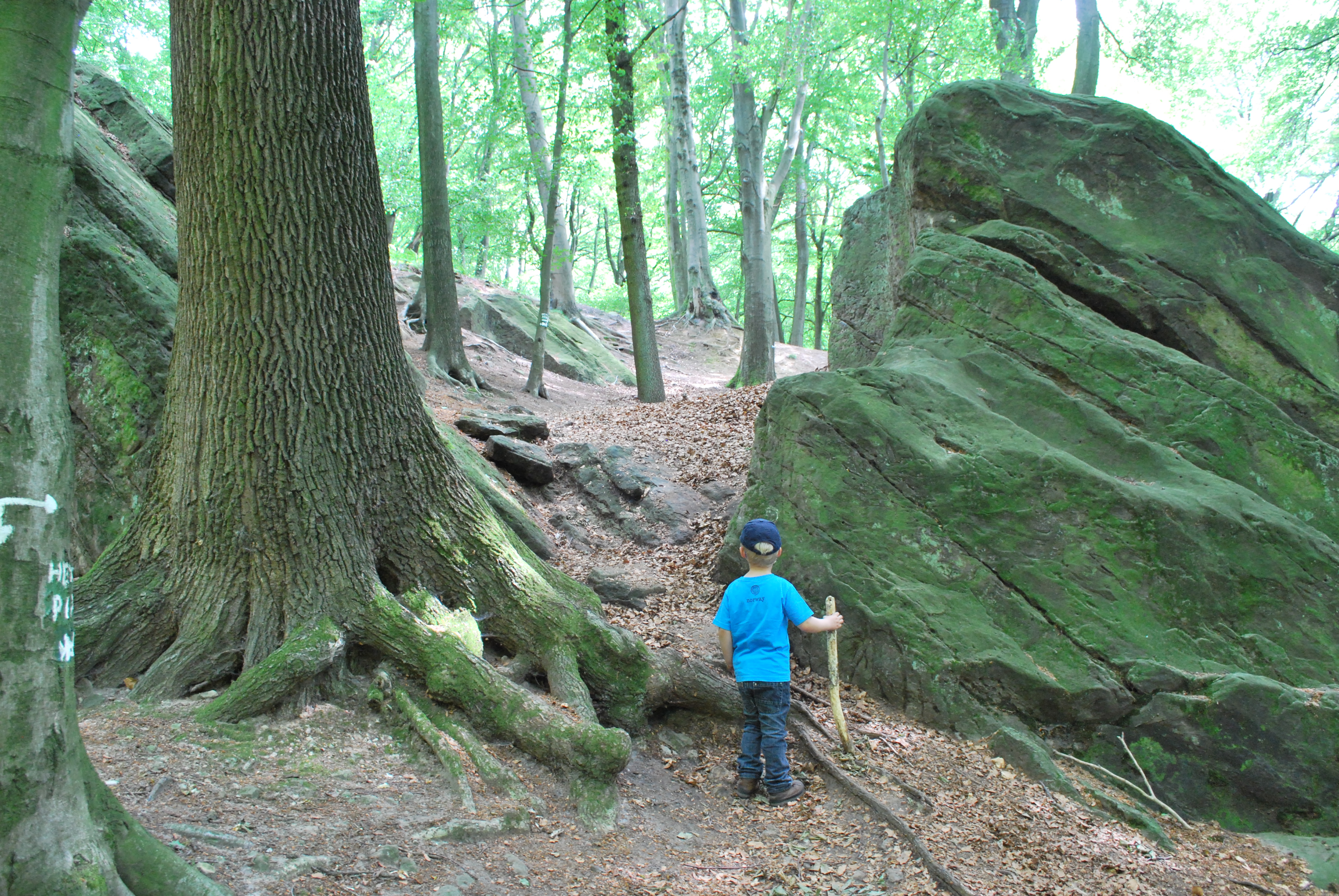 Von hier aus geht es nur ein paar Meter an der Straße entlang, bevor der Hexenpfad in den Wald abbiegt und von jetzt an fast nur noch über unbefestigte Wege und im wahrsten Sinne über „Stock und Stein“ führt. Für die Orientierung im Wald sorgt die weiße Hexe, die in regelmäßigen Abständen auf Schilder, Steine und Bäume gemalt ist und die Richtung vorgibt. Gleichzeitig ein gutes Motivationsspiel für müde, kleine Wanderer: Wer sieht als erstes die nächste Hexe?